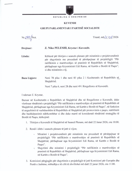Në shkresën drejtuar Kuvendit, grupi parlamentar i Partisë Socialiste thotë se bazuar në Kushtetutën e Republikës së Shqipërisë dhe në Rregulloren e Kuvendit, duke vlerësuar rëndësinë e projektligjit “Për ratifikimin e marrëveshjes së pranimit të Republikës së Shqipërisë, përfaqësuar nga Kryeministri Edi Rama, në Kartën e Bordit të Paqes”, në funksion të angazhimit të vazhdueshëm të Republikës së Shqipërisë për promovimin e paqes, stabilitetit dhe bashkëpunimit ndërkombëtar si dhe duke marrë në konsideratë rëndësinë strategjike të Bordit të Paqes, kërkojmë: