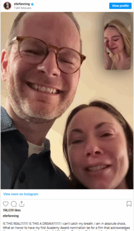 Aktorja është kandidate për çmimin Oscar për Aktoren më të Mirë Mbështetëse në Sentimental Value. Pasi u njoftuan nominimet për Çmimet e 98-ta të Akademisë të enjten, më 22 janar, dhe Fanning mësoi se ajo ishte midis të nominuarave për aktrim, ajo postoi një pamje të ekranit nga një telefonatë në FaceTime, duke kapur reagimin e saj ndaj lajmit të mirë. Në foto, Fanning shihet duke qarë ndërsa flet me regjisorin e Sentimental Value, Joachim Trier, dhe gruan e tij, Helle Bendixen Trier. Shihni postimin e saj.