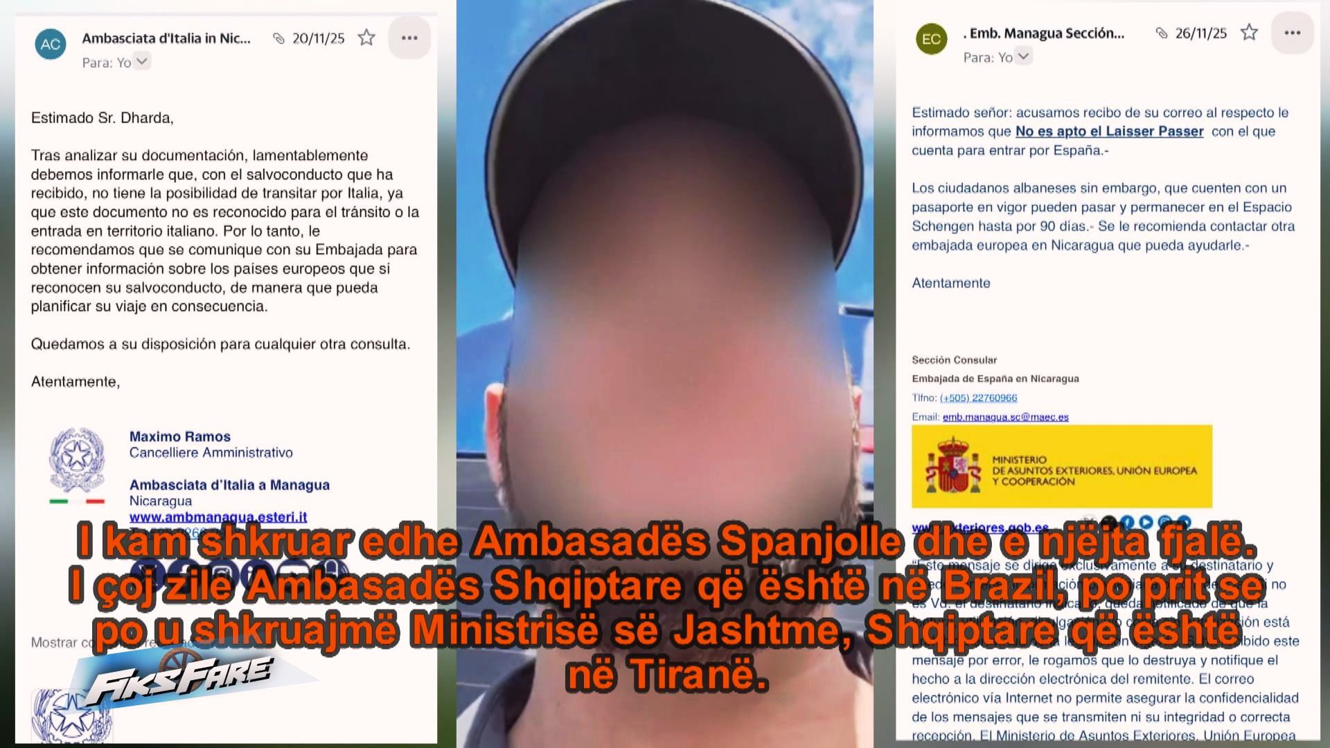 Në redaksinë e emisionit investigativ u ankua Aleksandër Dardha, i cili thotë se prej 6 vitesh jeton në atë shtet, ku ka krijuar edhe familje. Për shkak të problemeve familjare, ai nuk ka tashmë një pasaportë, por vetëm letra të rregullta nga Nikaragua.