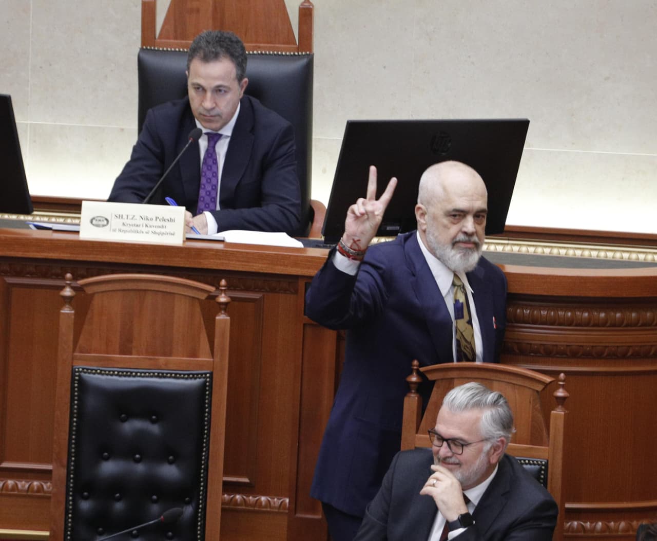 Para se të merrte fjalën, sikurse duket në fotot e shkrepura nga LSA, Rama përshëndeti opozitën me dy gishta, ndërsa në foltore iu afruan deputetët e opozitës.