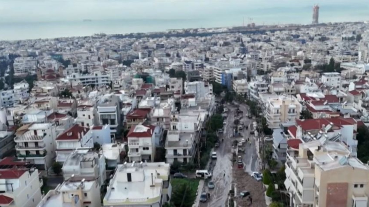 Pamjet me dron mëngjesin mbi lagjen Ano Glyfada të Athinës, tregojnë një pamje të paprecedente. Rrugë të shkatërruara, makina të bllokuara mes gurëve dhe baltës, si dhe lagje të tëra që duken sikur janë bombarduar.