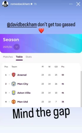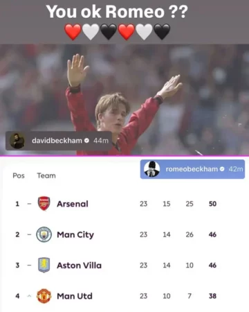 Romeo, 23 vjeç, nuk e la sfidën pa përgjigje. Pak më vonë, ai postoi një pamje të ekranit të tabelës së Premier League, duke i kujtuar babait të tij se Arsenali mbetej 12 pikë përpara United.