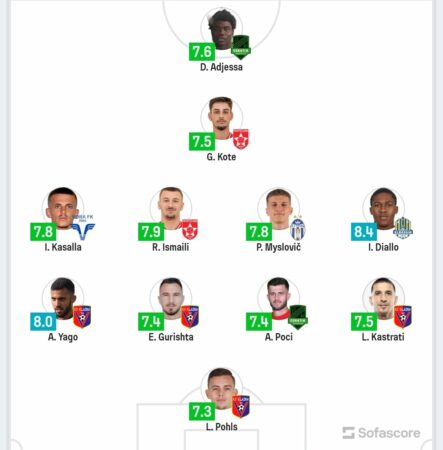 Më pas formacioni përbëhet nga një miks ekipesh ku janë dy lojtarë të Partizanit, Kote dhe Ismaili dhe dy të egnatias si Poci dhe Adjessa në sulm. Ndërkaq fitorja e Tiranës ndaj Flamuartarit në duelin e tyre të mbijetesës ka përfshirë Mysloviç, autorin e golit të vetëm në ketë formacion. Po ashtu edhe autorin e golit të të ekipit të Vorës Kasalla, për ndeshjen e mbyllur në barazim me Teutën 1-1 dhe padyshim qënuk mund të mungonte Autori i të dy golave të fitores së Elbasanit ndaj Dinamos, Diallo.