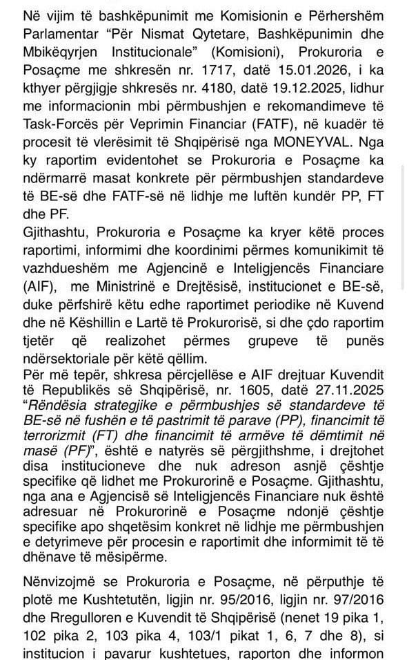 Megjithatë siç rendit edhe në shkresë, SPAK e ka kryer më herët raportimin mbi përmbushjen e rekomandimeve të Task forcës. Ky informim kryhet në kuadër të procesit të Shqipërisë nga Moneyval, Organizata Ndërkombëtare e Monitoritimit kundër pastrimit të parave.