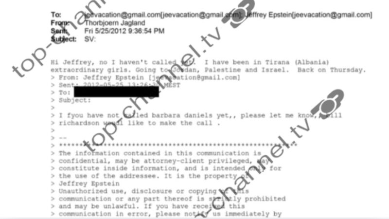 Top Channel ka siguruar një e-mail ku përmendet vendi ynë. Në njërin prej tyre mesazhi i është dërguar Jeffrey Epstein nga Thorbjorn Jagland, ish kryeministër i Norvegjisë dhe në atë kohë mbante postin e ish Sekretar i Përgjithshëm i Këshillit të Europës.