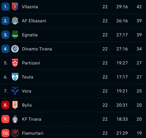 Renditja/ Vllaznia rimerr kreun, shkëputet +3 nga Elbasani dhe Egnatia, ndizet lufta për mbijetesë. Si paraqitet situata pas javës së 22-të