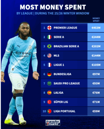 Përgjigjja tashmë dihet; edhe këtë vit, Premier League u konfirmua si turneu më i pasur në botë. Sipas të dhënave të ‘Transfermarkt’ kampionati anglez ka shpenzuar mbi 450 milionë euro në merkaton e janarit dhe skuadra që ka investuar më shumë është pikërisht Manchester City që për blerjen e Semenyo dhe lojtarëve të tjerë shpenzoi 100 milionë euro