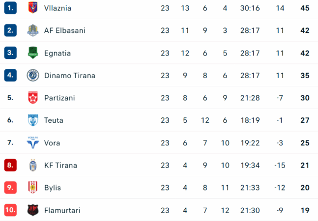 Bardheblutë po përjetojnë një ringritje të dukshme, teksa tashmë numërojnë 21 pikë dhe për herë të parë pas shumë javësh janë ngjitur në zonën “play-out”. Distanca me Vorën, që ndodhet jashtë zonës së rrezikut, është vetëm 4 pikë, duke mbajtur të hapur luftën për mbijetesë.