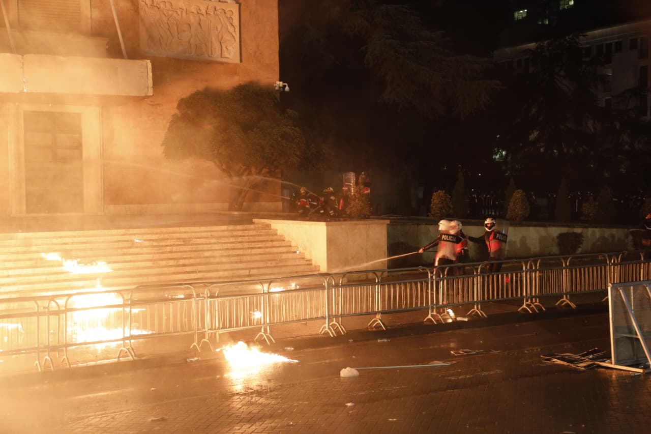 Katër orë protestë para Kryeministrisë dhe Kuvendit/ Hidhen dhjetëra molotovë, policia kundërpërgjigjet me gaz lotsjellës, 16 efektivë të plagosur, deputeti i PD përfundon te Trauma