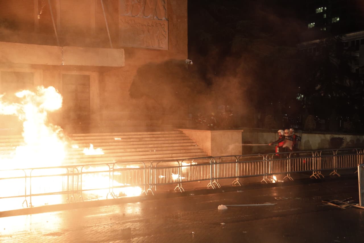 Gazetarja e Top Channel, Elda Menga, përcolli nga vendngjarja pamje të arrestimit të protestuesve, të cilët hodhën sende të forta drejt policisë.