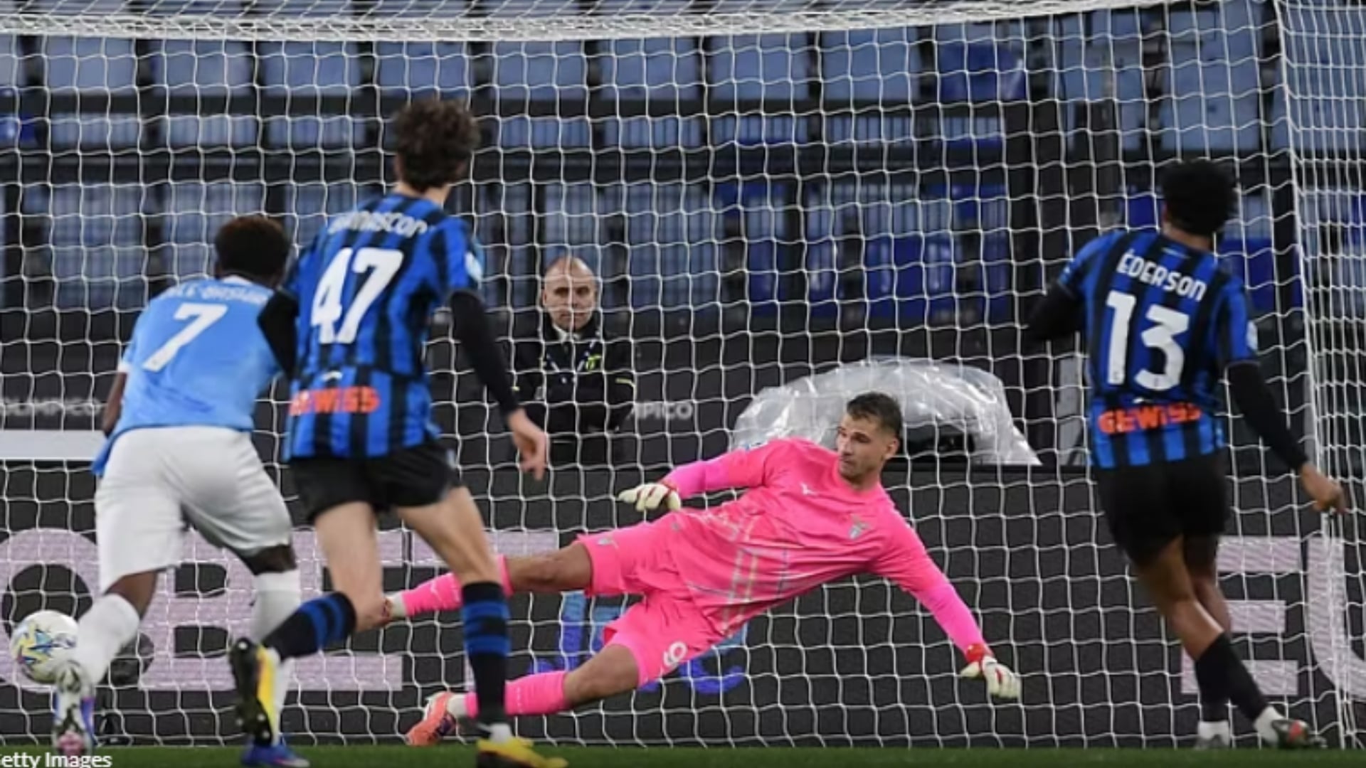 Në një Olimpico të boshatisur, pasi vijon kontestimi i tifozëve lazialë, Atalanta arriti ta zhbllokojë rezultatin vetëm në minutën e 41 me një penallti të ekzekutuar saktë nga Ederson me brazilianin që shënoi golin e tij të parë në Serie A.