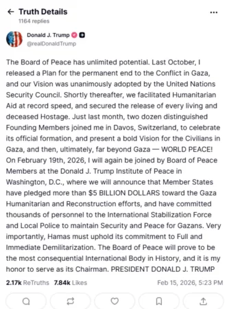 “Është shumë e rëndësishme që Hamasi të mbajë fjalën e tij për demilitarizim të plotë dhe të menjëhershëm”, shkroi presidenti i SHBA-së në Truth Social, duke shtuar se anëtarët e “Këshillit të Paqes” të tij do të njoftojnë, gjatë një takimi më 19 shkurt në Uashington, ndarjen e 5 miliardë dollarëve për rindërtimin e territorit palestinez.