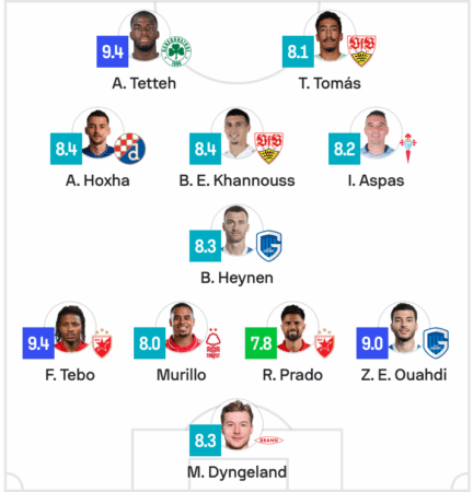 Formacioni i javës i ‘Sofascore’: Dyngeland; Tebo, Murillo, Prado, Ouahdi; Heynen; Hoxha, Khanouss, Aspas; Tetteh dhe Tomas.