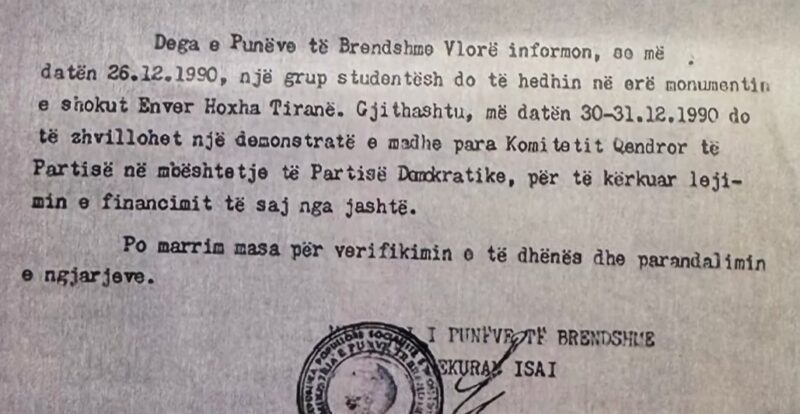 “Dega e Punëve të Brendshme Vlorë informon, se më datën 26.12.1990, një grup studentësh do të hedhin në erë monumentin e shokut Enver Hoxha Tiranë. Gjithashtu, më datën 30-31.12.1990 do të zhvillohet një demonstratë e madhe para Komitetit Qendror të Partisë në mbështetje të Partisë Demokratike, për të kërkuar lejimin e financimit të saj nga jashtë. Po marrim masa për verifikimin e të dhënës dhe parandalimin e ngjarjeve”, shkruan Hekuran Isai.