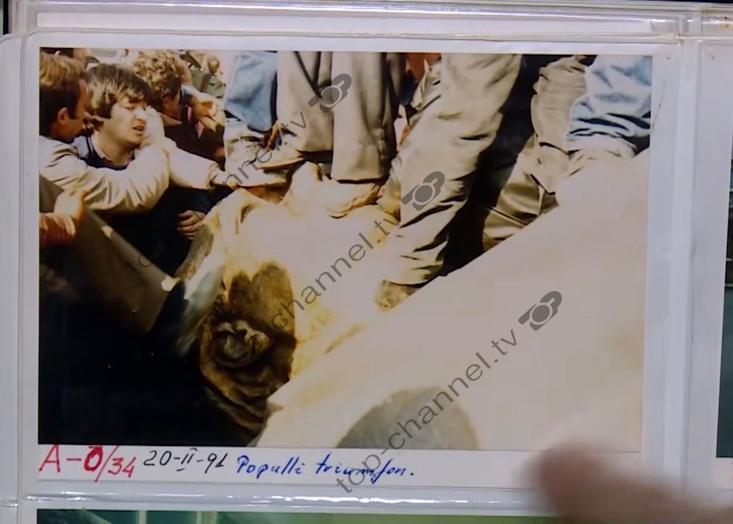 “Këto në foto janë momentet e para, pa rënë busti. Njerëz të shpërndarë, polici, gaz, tymuese, njerëz të dëmtuar. Kishte reagime nga policia. Këtu është para se të binte busti, ja dhe qeni në foto të cilin e kishin marrë për të larguar njerëzit. Pastaj gjuanin me pushkë për t’i larguar njerëzit, ndërsa unë rrija i fshehur. Nuk më shkonte kurrë në mendje që do të binte busti. Ishim rritur me mentalitetin se nuk do të binte.