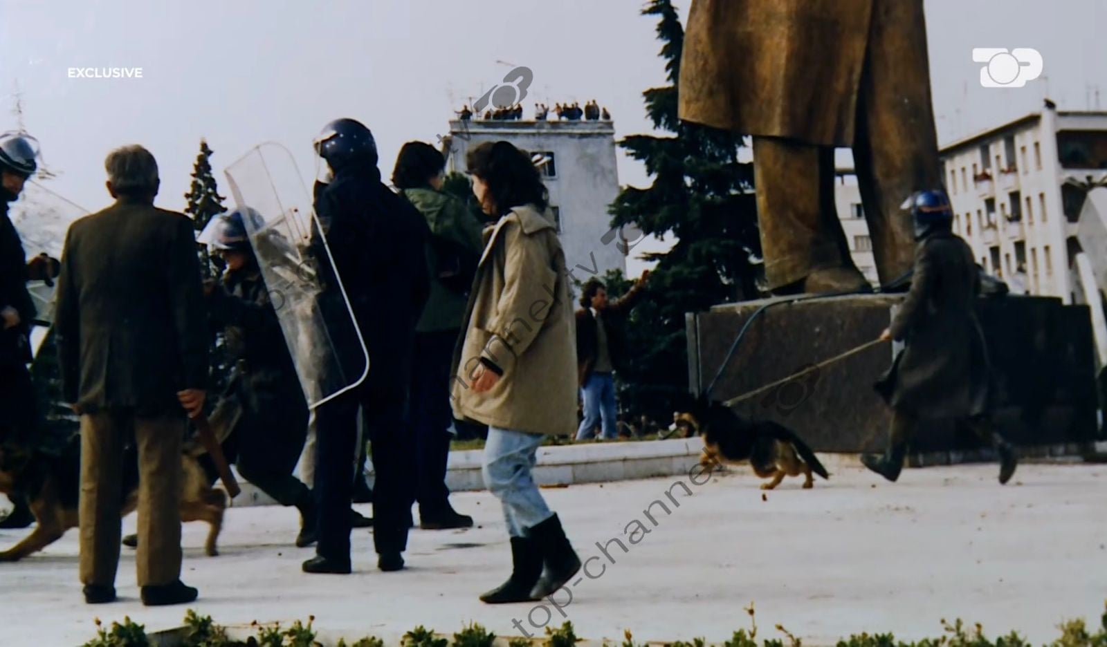 “Këto në foto janë momentet e para, pa rënë busti. Njerëz të shpërndarë, polici, gaz, tymuese, njerëz të dëmtuar. Kishte reagime nga policia. Këtu është para se të binte busti, ja dhe qeni në foto të cilin e kishin marrë për të larguar njerëzit. Pastaj gjuanin me pushkë për t’i larguar njerëzit, ndërsa unë rrija i fshehur. Nuk më shkonte kurrë në mendje që do të binte busti. Ishim rritur me mentalitetin se nuk do të binte.