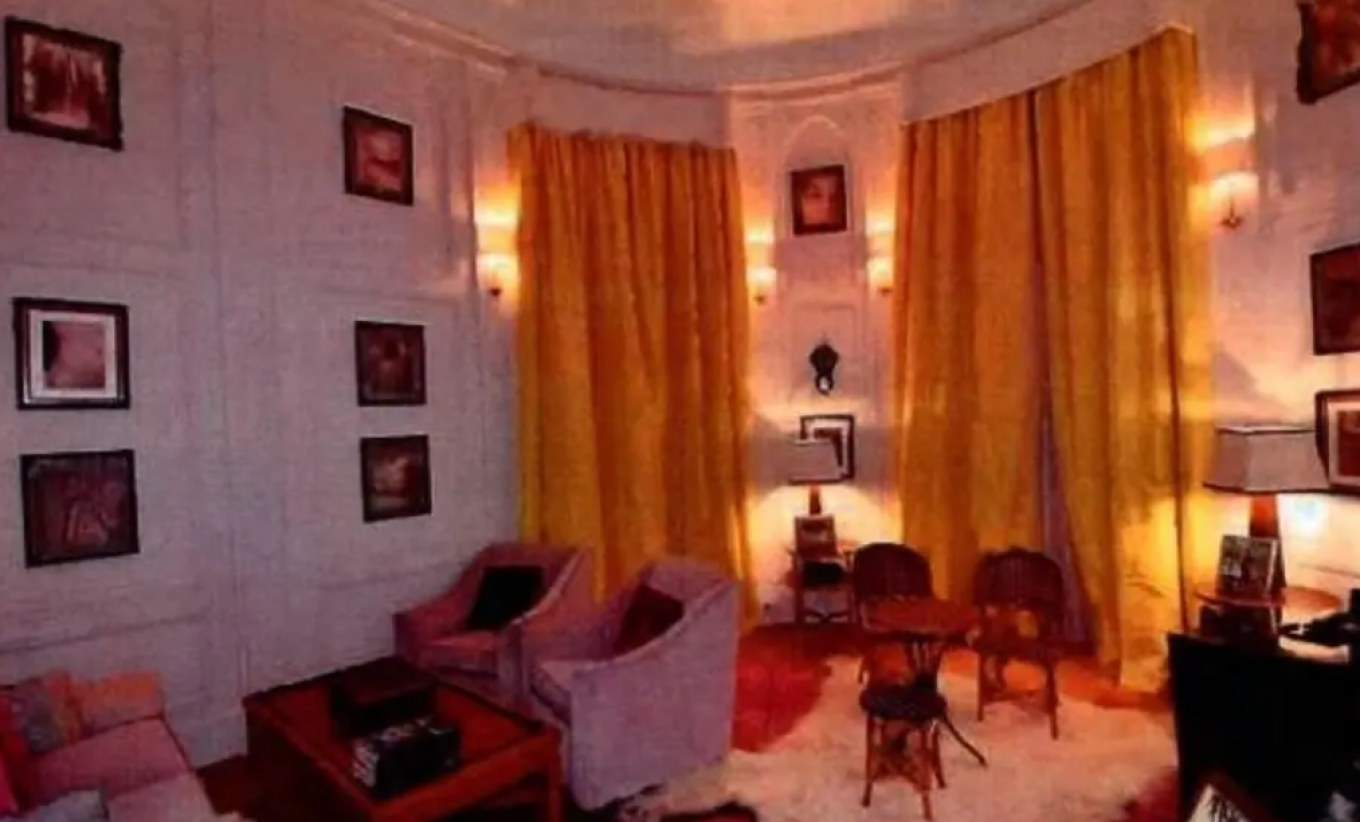 I gjithë apartamenti, i blerë në vitin 2001, është i lyer në nuanca të kuqes, portokallit dhe rozës, dhe muret janë të mbuluara me fotografi grash të zhveshura – përfshirë një që tregon Epsteinin pranë dy grave pa bluzë.