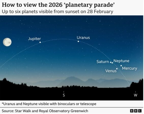 Menjëherë pas perëndimit të diellit, planetët do të shfaqen afërsisht në të njëjtën pjesë të qiellit, duke formuar atë që shpesh quhet “paradë planetare”. Mërkuri, Venusi, Saturni dhe Jupiteri do të jenë të dukshëm me sy të lirë, ndërsa Urani dhe Neptuni ka të ngjarë të kërkojnë dylbi ose një teleskop.