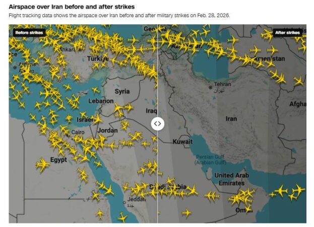 Të dhënat nga Flightradar24 tregojnë pothuajse asnjë trafik ajror mbi Iran dhe vende të tjera të Lindjes së Mesme pas sulmeve. Grafiku krahason trafikun ajror të një jave më parë me trafikun e mbrëmjes së së shtunës, sipas kohës lokale.