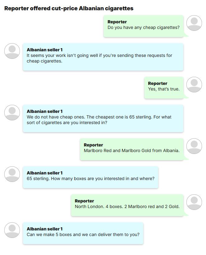 Një llogari në TikTok dhe Facebook ka vepruar nën një emër që përkthehet përafërsisht si “paketa cigaresh shqiptare” dhe ofron cigare nga Greqia dhe Shqipëria për dërgesë në shtëpi.