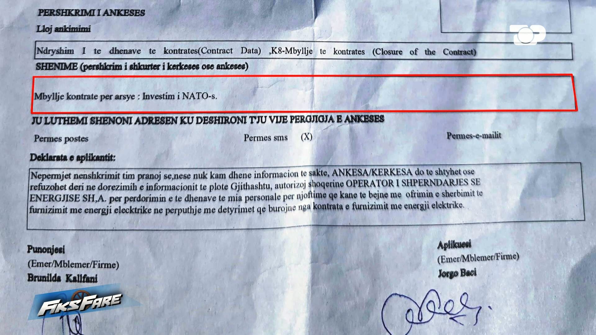 Ai thotë se ka marrë një dëmshpërblim prej 6 milionë lekësh, ndërkohë që arsyeja që i është drejtuar Fiksit është për shkak se, në momentin e demontimit të banesës, në muajin shkurt të vitit 2023, i kanë shkuar punonjësit e OSHEE-së dhe i kanë hequr matësin. Deri në atë kohë s’ka pasur asnjë detyrim të prapambetur. Më pas, ka shkuar në zyrat e OSHEE në Berat dhe ka bërë kërkesë për mbylljen e kontratës, ku në dokument shkruhet se “mbyllje kontrate për arsye ‘investim i NATO-s”.