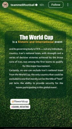 Në deklaratën e saj, kombëtarja e Iranit theksonte se pjesëmarrja e saj në turne nuk vendoset nga asnjë individ apo shtet. ‘Botërori është një ngjarje historike dhe ndërkombëtare dhe organizmi drejtues i tij është FIFA dhe jo ndonjë vend çfarëdo-thekson përfaqësuesja e Iranit-kombetarja iraniane falë forcës dhe fitoreve vendimtare të marra nga djemtë kurajozë të Iranit, ishte ndër të parat ekipe që u kualifikuan për këtë turne të rëndësishëm. Sigurisht askush nuk mund të përjashtojë kombëtaren iraniane nga Botërori; i vetmi vend që mund te ishte përjashtuar është ai që mban vetëm titullin e pritësit të eventit, por që nuk është në gjendje që të garantojë sigurinë e skuadrave pjesëmarrëse në këtë event global’.