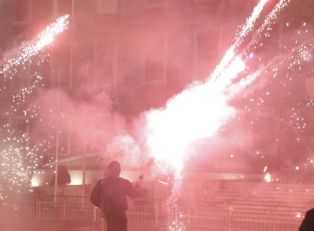 20:00 Noka përplaset me policinë, thyen kordonin e sigurisë pranë Piramidës, hidhen molotovë
