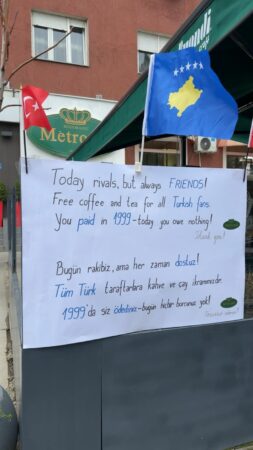 Një foto e shkrepur nga Prishtina është bërë virale pasi një bar-kafe do të ofrojë kafe dhe çaj falas për fansat turq. “Sot rivalë, por gjithmonë miq. Kafe dhe çaj falas për të gjithë fansat turq. Ju i paguat në vitin 1999 dhe sot nuk na detyroheni asgjë. Faleminderit”, shkruhet në një banderolë të vendosur jashtë bar-kafesë.
