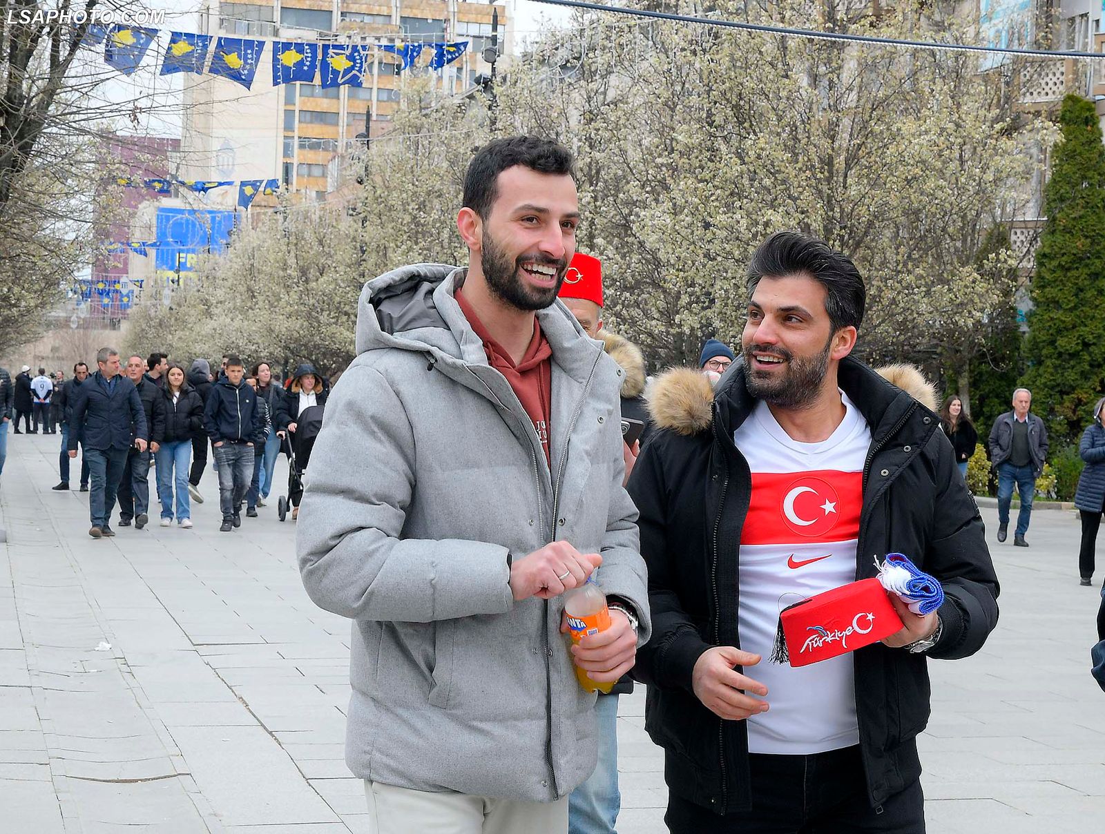 Përpara sfidës, tifozët shqiptarë dhe ata turq janë bërë bashkë, duke festuar dhe duke shkëmbyer flamujt dhe fanellat.