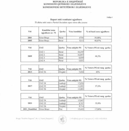 Dokumenti i firmosur nga kreu i KQZ-së, Ilirjan Celibashi, e pozicionon Braçen si një ndër figurat politike më të votuara në shkallë vendi.