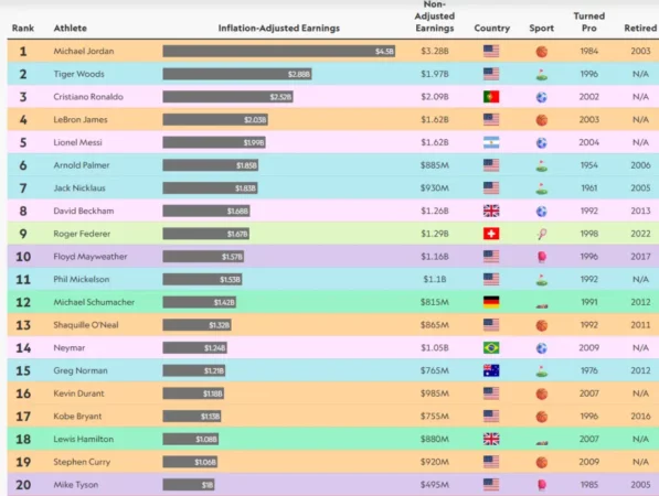 50 atletët më të paguar të të gjitha kohërave, siç janë paraqitur nga Sportico, kanë një total prej 56.2 miliardë dollarësh për të treguar për fitimet në kohën kur kanë qenë aktiv dhe 40 miliardë dollarë në bazë nominale deri në fund të vitit 2025. Michael Jordan mbetet atleti më i paguar në botë, aktiv por edhe tani që është në “pension”, falë partneritetit të tij të shkëlqyer me Nike që nënshkroi në vitin 1984 kur hyri në NBA. Jordan fitoi rreth 275 milionë dollarë në vitin 2025, kryesisht nga Nike.