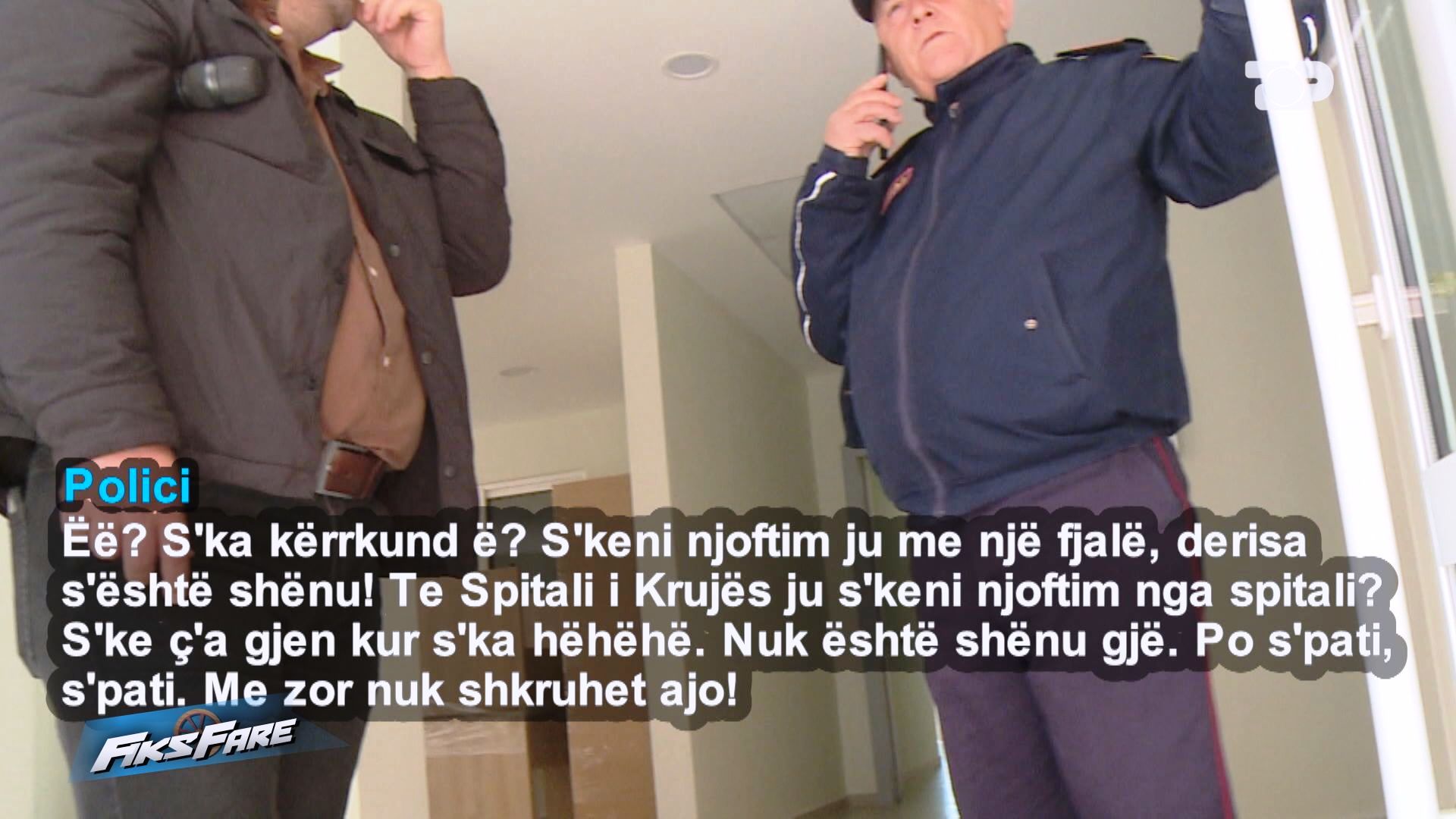 Polici – Ëë? S’ka kurrkund ë? S’keni njoftim ju me një fjalë, derisa s’është shënu! Te Spitali i Krujës ju s’keni njoftim nga spitali? S’ke ç’a gjen kur s’ka hëhëhë. Nuk është shënu gjë. Po s’pati, s’pati. Me zor nuk shkruhet ajo!