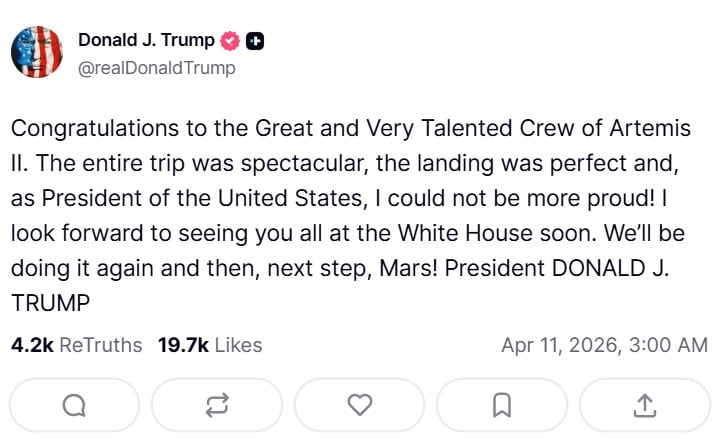 “Urime ekuipazhit të madh dhe shumë të talentuar të Artemis II. I gjithë udhëtimi ishte spektakolar, ulja ishte perfekte dhe, si President i Shteteve të Bashkuara, nuk mund të jem më krenar!”, tha Trump në një postim në Truth Social.