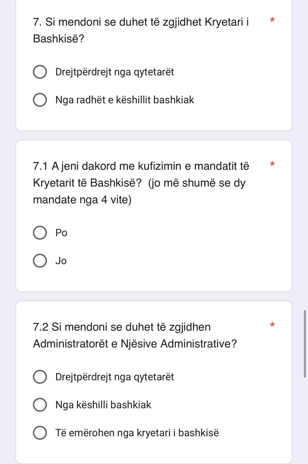 Gjithashtu qytetarët pyeten edhe nëse janë dakord me kufizimin e mandatit të Kryetarit të Bashkisë në jo më shumë se dy mandate nga 4 vite. Dilema e demokratëve është edhe për mënyrën sesi duhet të ndahet pushteti vendor ku për opinion PD ka shtruar dhe pyetjen nëse duhet të ketë dy nivele; Bashki dhe Rajon, raporton Top Channel.