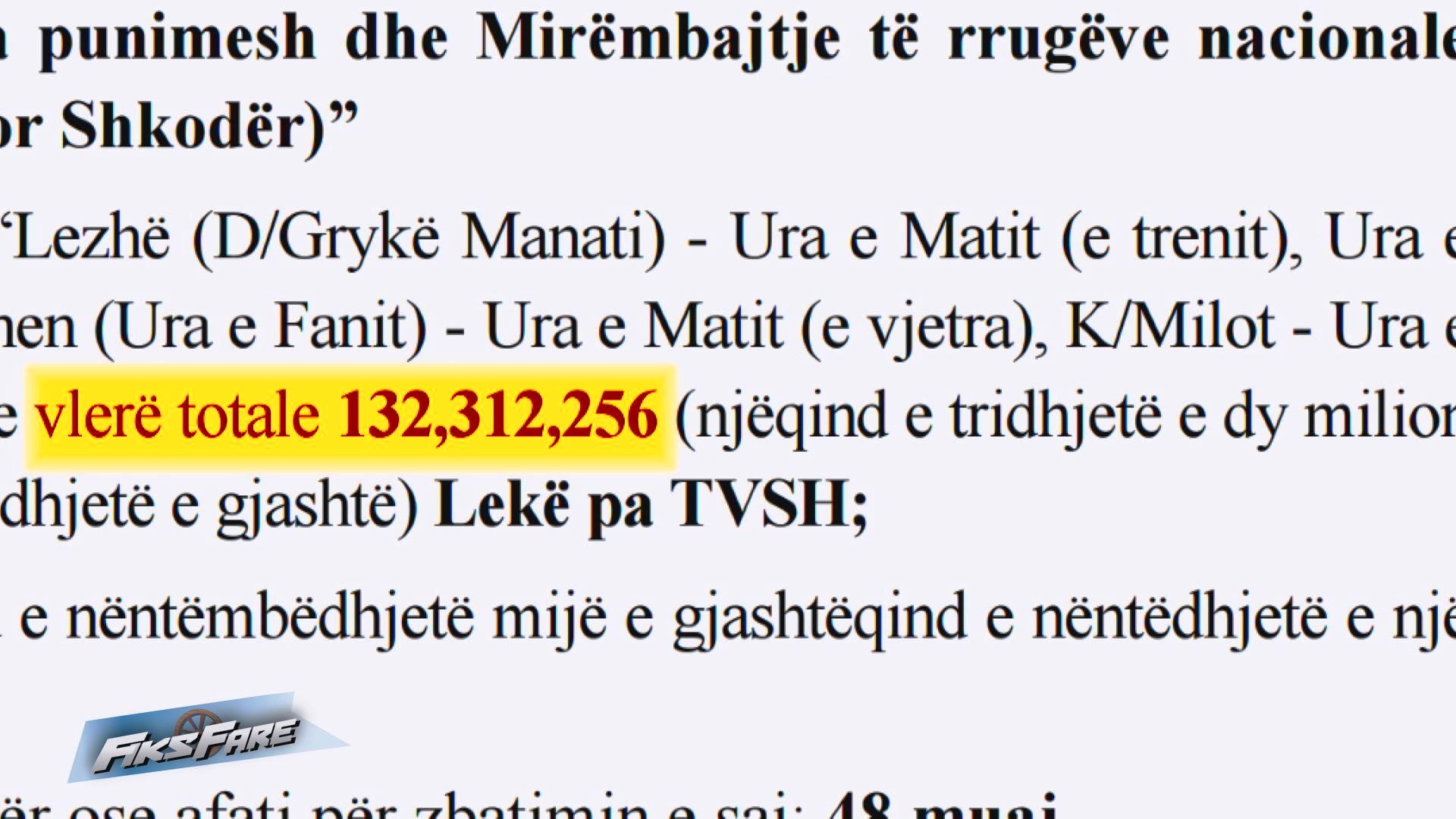 Fiks Fare ka mësuar se, ARRSH ka një kontratë në fuqi me një kompani për mirëmbajtjen e një aksi prej 36.5 km, në rajonin verior, ku është përfshirë edhe Ura e Trenit në Milot. Tenderi është hapur në vitin 2024 dhe ka një afat 4 vjeçar, teksa vlera është 132 milionë lekë.