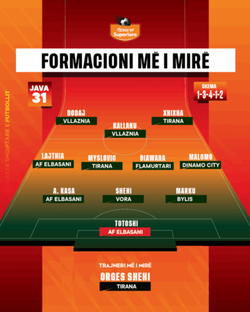 Java e 31-të e kampionatit “Abissnet Superiore” u mbyll mbrëmë me ndeshjen e fundit AF Elbasani – Partizani. Trajnerët e ekipeve kombëtare kanë përzgjedhur formacionin dhe trajnerin më të mirë të javës së 31-të, sipas skemës 1-3-4-1-2.