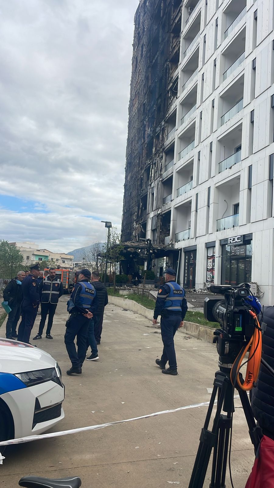 Mëngjesin e sotëm, pas shuarjes së flakëve, pamjet nga vendngjarja tregojnë një situatë të rëndë, ku fasada e ndërtesës është djegur pothuajse tërësisht.