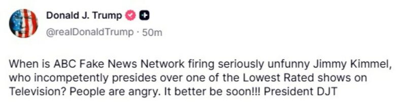“Njerëzit janë të indinjuar. Shpresoj që kjo të ndodhë së shpejti”, shkroi Trump, duke lënë të kuptohet për një pakënaqësi më të gjerë publike ndaj figurës së Kimmel.