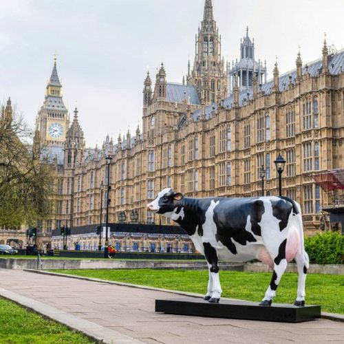 Një lopë në Westminster në qendër të Londrës, vendasit të habitur nga skulptura e pazakontë
