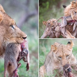 Fund i trishtë për këlyshin e guximshëm/ Majmuni bebe mbahet te trupi i të ëmës, edhe brenda gojës së luanit (foto të rënda)