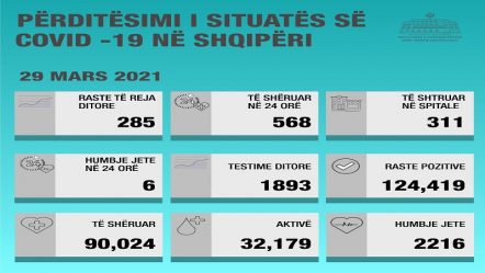 Ulje drastike e rasteve me COVID/ 311 të shtruar në spitale, 6 humbje jete në 24 orë 29/03/2021 17:54