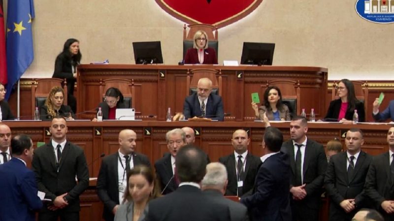Përplasje në kuvend për portin/ Opozita bllokon foltoren, ndërpritet seanca. Fjalimet “online”