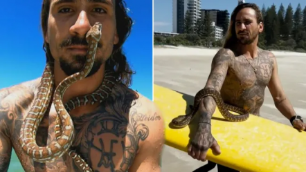 Video/ Burri merr pitonin e tij për xhiro me surf por gjobitet nga autoritetet (fotot)