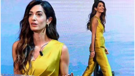 Amal Clooney shfaqet elegante në mëndafsh të verdhë në turneun “Zgjedhim Tokën” në Madrid (fotot)