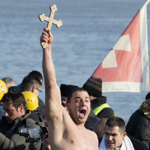 Ortodoksët serbë notojnë në lumin e akullt për kryqin e Epifanisë (fotot)