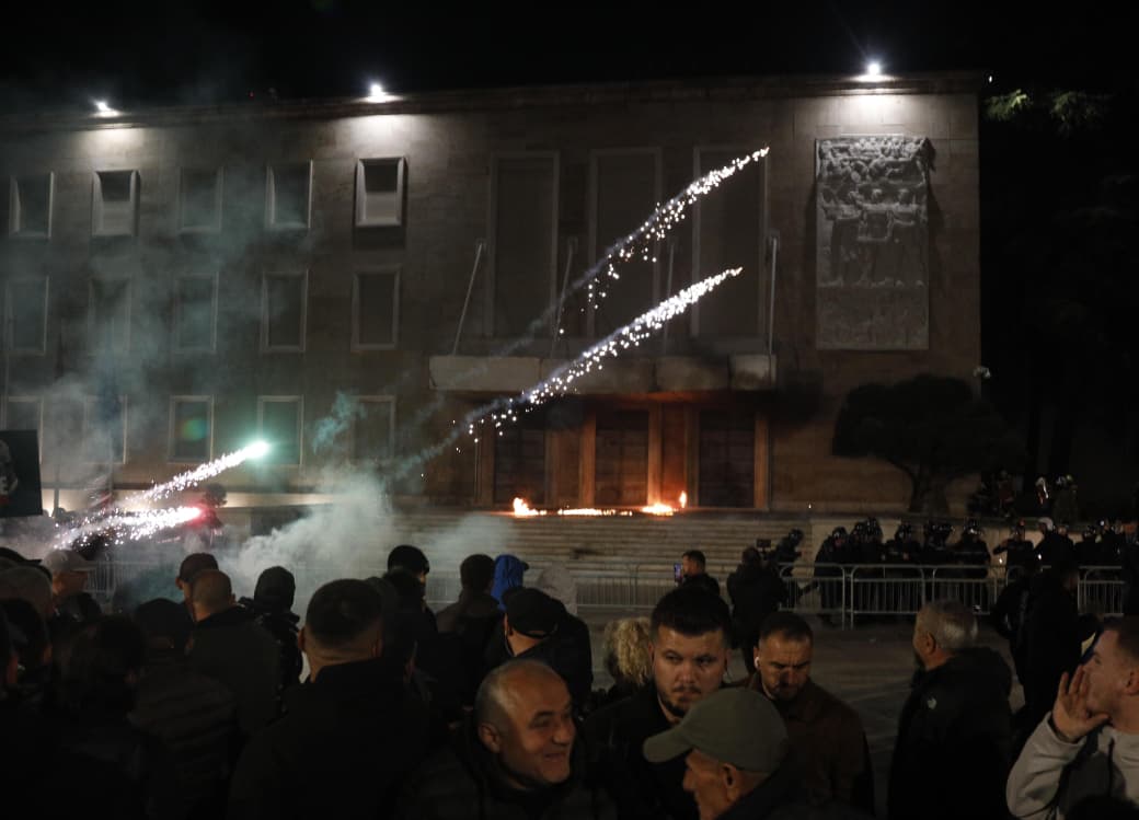 Foto Galeri • PD 3 orë protestë me molotovë, fishekzjarre dhe flamurin gjerman. Berisha lëndohet me spray në sy. Katër efektivë të policisë të plagosur