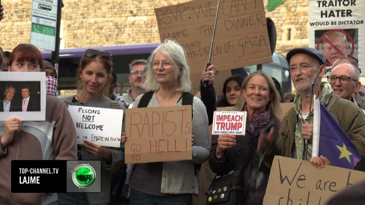 Top Channel/ Trump mbërrin në Britaninë e Madhe, e presin me fotot e Epstein!
